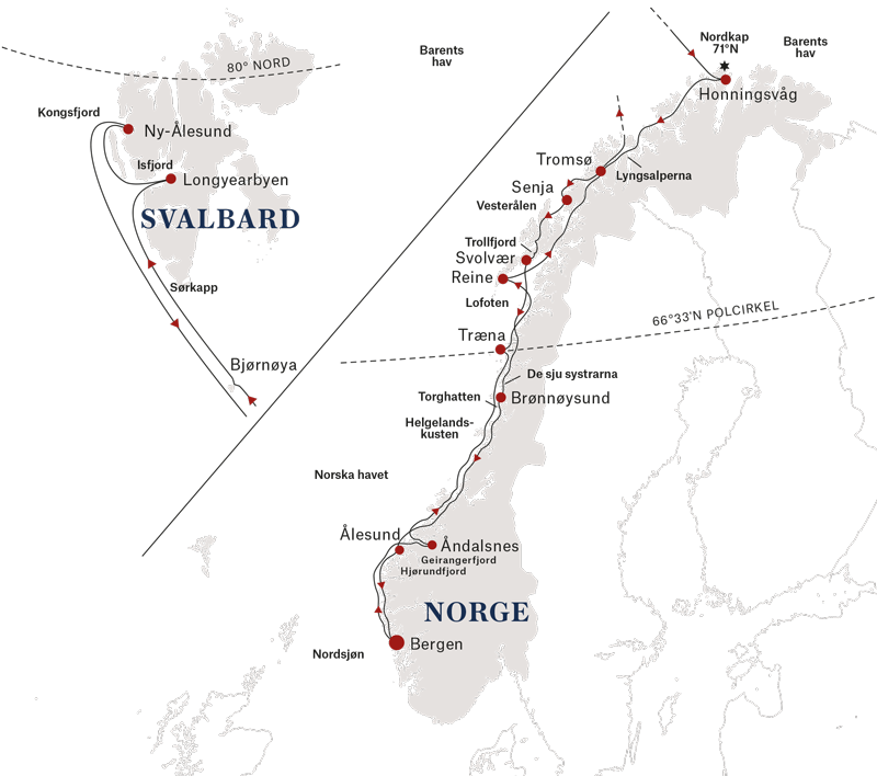 - Svalbardlinjen går mellan Bergen och Longyearbyen på Svalbard och kan upplevas som 16-dagarsresa eller på halva sträckan, med MS Trollfjord och MS Midnatsol.