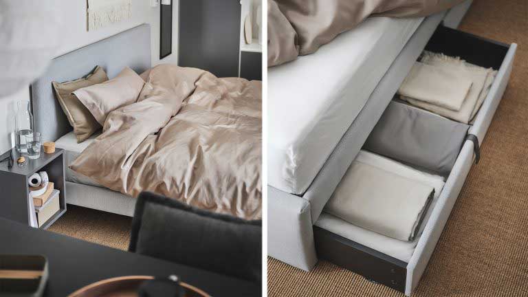 – Dubbla funktioner. En sängstomme med förvaring eller en smart låda som får dubblera som sängbord – genom att använda möbler med inbyggd förvaring använder du utrymmet till max.