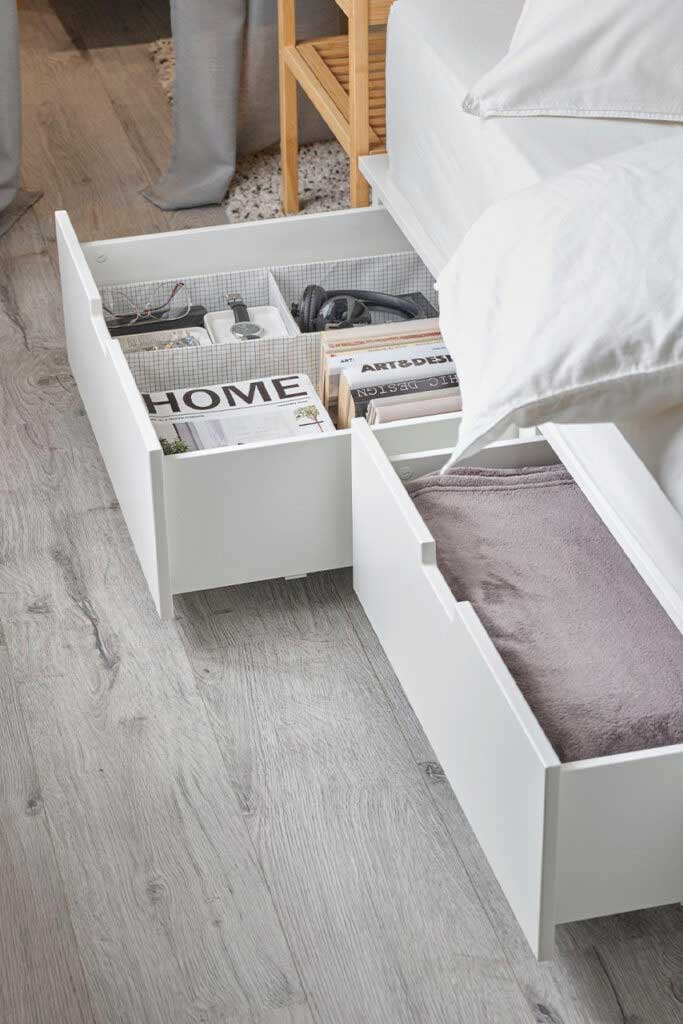 – När du väljer säng ska den såklart vara fin och bekväm, men du bör också fundera på om den ska innehålla förvaring. IDANÄS från IKEA är en klädd sängstomme med mjukstängande lådor under sängen. Klassiska knappdetaljer och svarvade träben ger en tidlös känsla.
