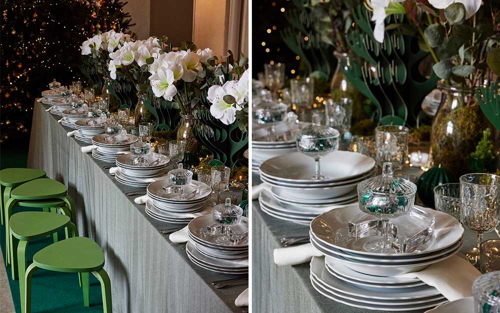 För dig som trivs bäst när more is more – här är en dukning med massor av glitter och glans, romantik och glamour. De perfekta förutsättningarna för en fest som aldrig vill ta slut och där mat och dryck får flöda. Kristallglas ger extra elegans, silver och glittrande ljusslingor skapar en magisk stämning och gröna inslag ger värme och liv. Toppa det hela med massor av pampiga julblommor och ingen kommer någonsin att tro att ditt kök också knäcker extra som vardagshjälte.