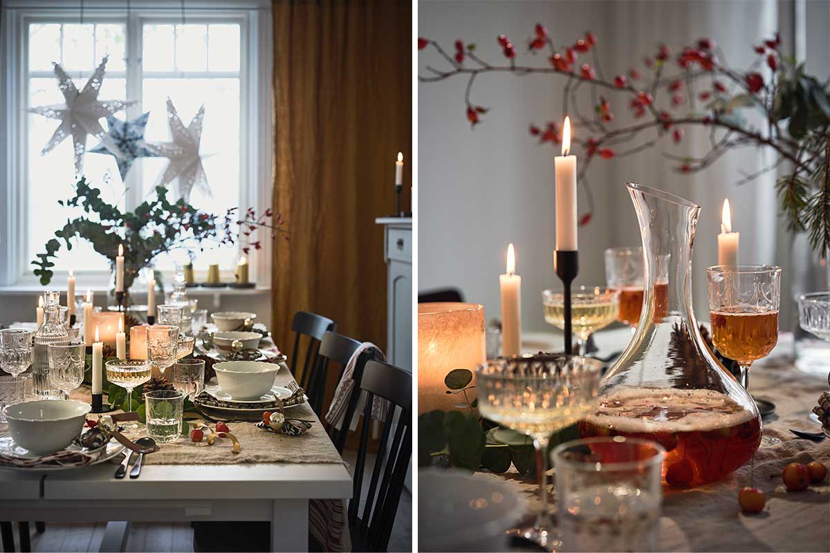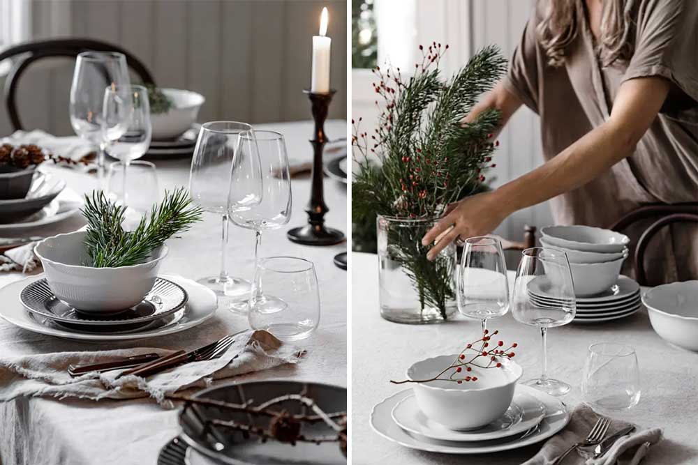 Med mjuka, naturliga färger och inslag av kvistar, bär och grenar skapar den här juldukningen en avslappnad atmosfär. Naturmaterial som linne och trä utstrålar värme och enhetliga färger skapar lugn och harmoni. Blanda ditt favoritporslin för en mer personlig känsla och låt gästerna slå sig ner vid ett bord som visar vägen till ett glädjefyllt och varmt julfirande.