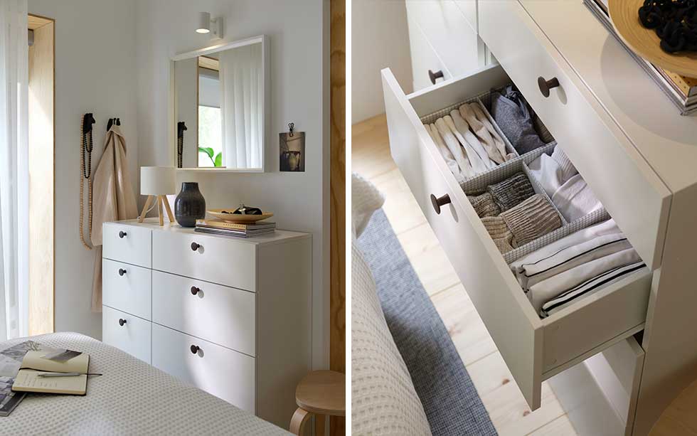 Tillräckligt mycket förvaring är också viktigt när du vill skapa ett sovrum med känsla av rymd. Om var sak verkligen har sin plats slipper du ha grejer framme som bidrar till en känsla av stök och röra, något man verkligen vill undvika när ytan är begränsad. I en rejäl byrå kan du stuva undan det mesta. Med rätt inredning blir det också enkelt att hitta det du söker och ordningen gör dessutom att det får plats fler grejer. Och byrån är inte alls bara för kläder – här kan du med fördel också förvara sängkläder eller extra filtar och kuddar. Då har du dem nära till hands när det är dags att till exempel byta dem efter säsong.