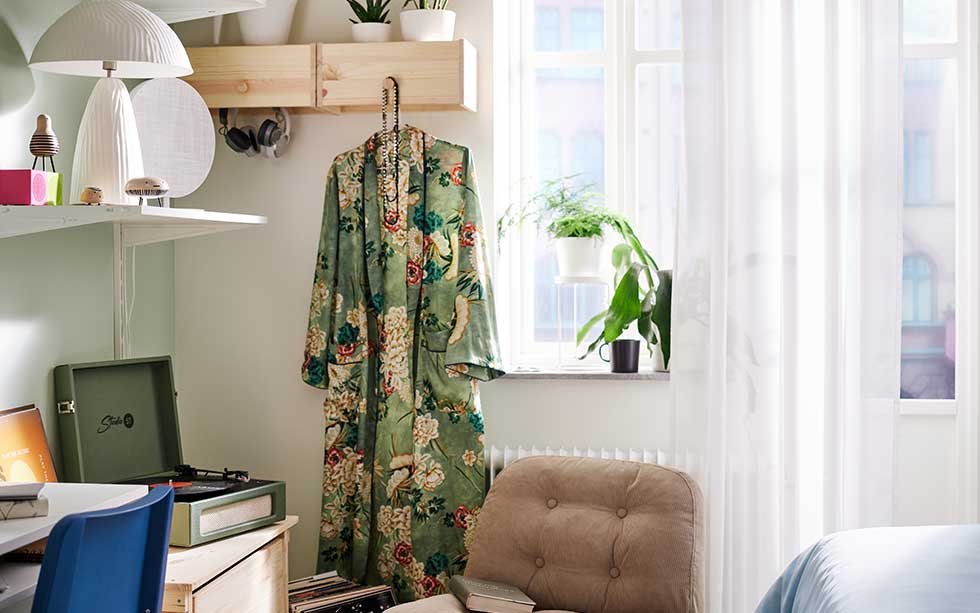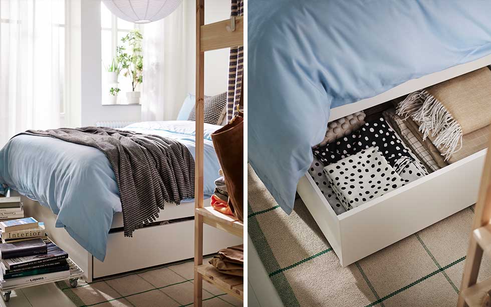För att skapa en känsla av rymd i det lilla sovrummet är ett bra knep att hitta plats för förvaring där den inte syns. Som under sängen, till exempel. Med en sängstomme med inbyggda lådor trollar du enkelt bort allt från sängkläder till skrymmande plagg eller kanske skorna du inte använder just nu. En rullvagn som INVALLNING är också en smart förvaringslösning som är enkel att flytta när du behöver ytan till annat. Placera den framför sängen, mot en vägg eller till exempel under ett skrivbord.