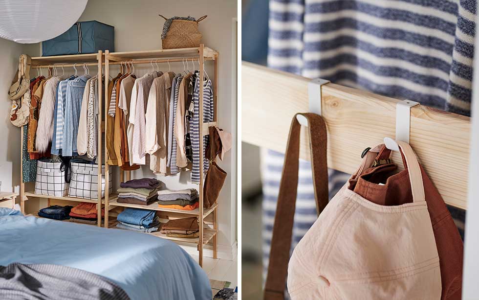 Med krokar på sidan av klädstången kan du enkelt hänga av dig kepsen eller handväskan som ofta används. KRONÖREN öppen garderob 599:- STAJLIG galge 59:- /5 FLÅDIS korg 79:- LÄTTHET krok och klämma 15:- /2 st