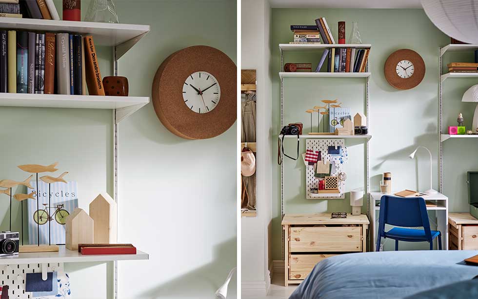 Medan vissa prylar passar bäst under sängen, finns det kanske andra som du vill ska synas desto mer. Ett sovrum som kombinerar dold och öppen förvaring löser båda utmaningarna. I den öppna väggförvaringen kan du placera älsklingsobjekten som gör dig glad och som du vill se varje dag. Ett sådant hyllsystem är också lätt att bygga på höjden, för att ytterligare maxa förvaringen.