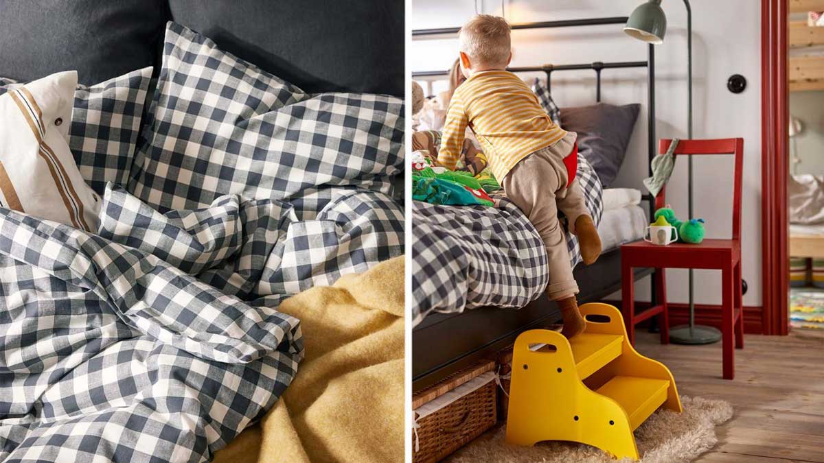 EKTANDVINGE påslakanset 249:-, PINNTORP stol 395:-, KLAPPA speldosa 79:-, TROGEN stegpall för barn 249:-