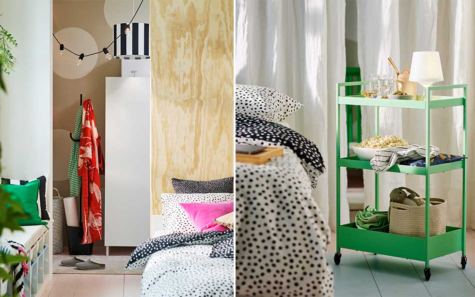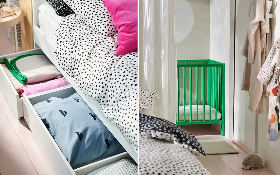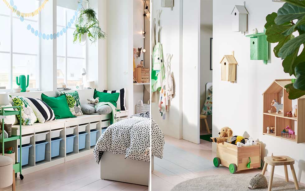 Leksaker är en annan grej som tenderar att sprida ut sig över hela det delade sovrummet. Och det är väl okej – rummet ska ju gillas av alla, eller hur? Men när det är tid för läggdags är det skönt att snabbt kunna stuva undan dem i backar eller lådor. En sittbänk byggd av TROFAST stommar kan dubblera som både praktisk förvaring och mysig sitthörna, både för godnattsagan och kvällsamningen.