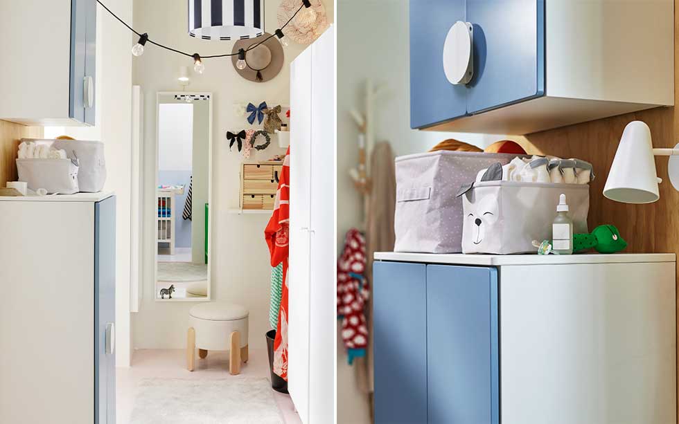 Barn växer snabbt – och klädförvaringen behöver kunna växa med dem. För bebisens kläder passar det kanske bäst med lådor, där finns inte mycket som behöver hängas upp eller som riskerar att bli skrynkligt. För plagg och andra prylar som används ofta kan det vara smidigt med förvaring ovanpå byrån eller den låga garderoben; då går grejerna fort att hitta om det plötsligt blir bråttom ut genom dörren eller om (blöj-)olyckan är framme.