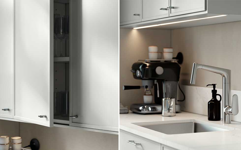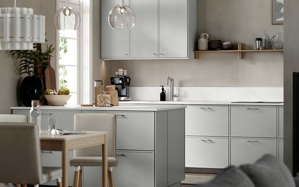 Släta luckor i köket bidrar till en lugnare känsla i köket, även när livet egentligen snurrar lite för fort. ASPUDDEN lådfront 379:- STOCKHOLM 2025 taklampa 899:- JAKOBSBYN/JÄLLBY taklampa 449:-
