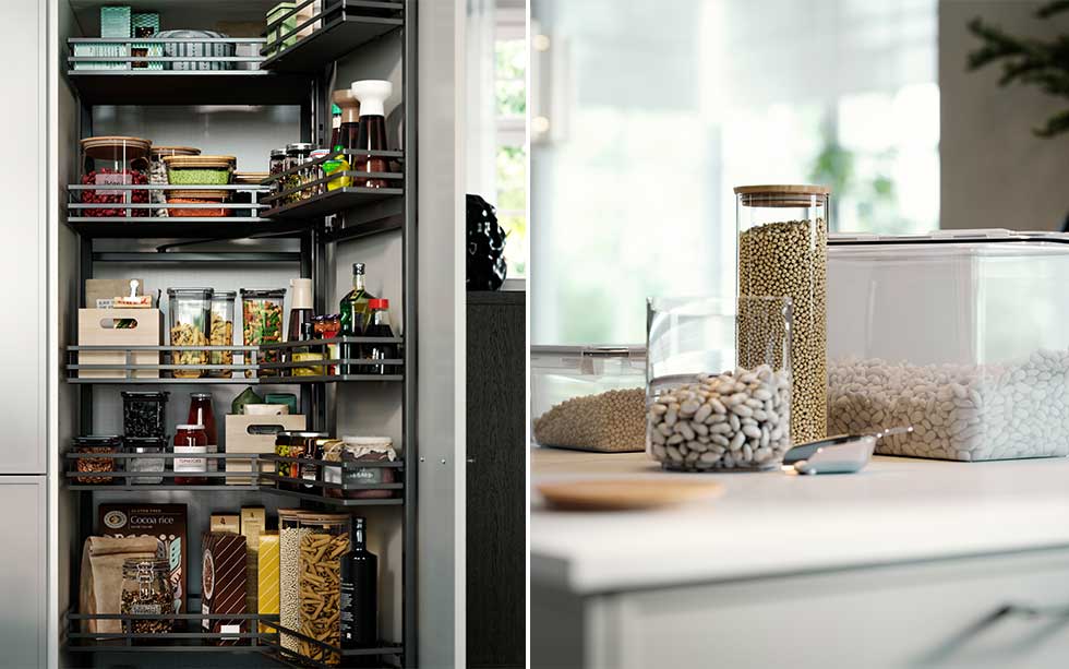 Ett utdragbart skafferi ger en snabb överblick. UTRUSTA skafferiutdrag 5495:- UPPDATERA förvaringsbox 149:- IKEA 365+ matlåda, plast 99:- IKEA 365+ matlåda, glas 59:- IKEA 365+ skopa, set om 2, 49:- EKLATANT burk med lock 99:-