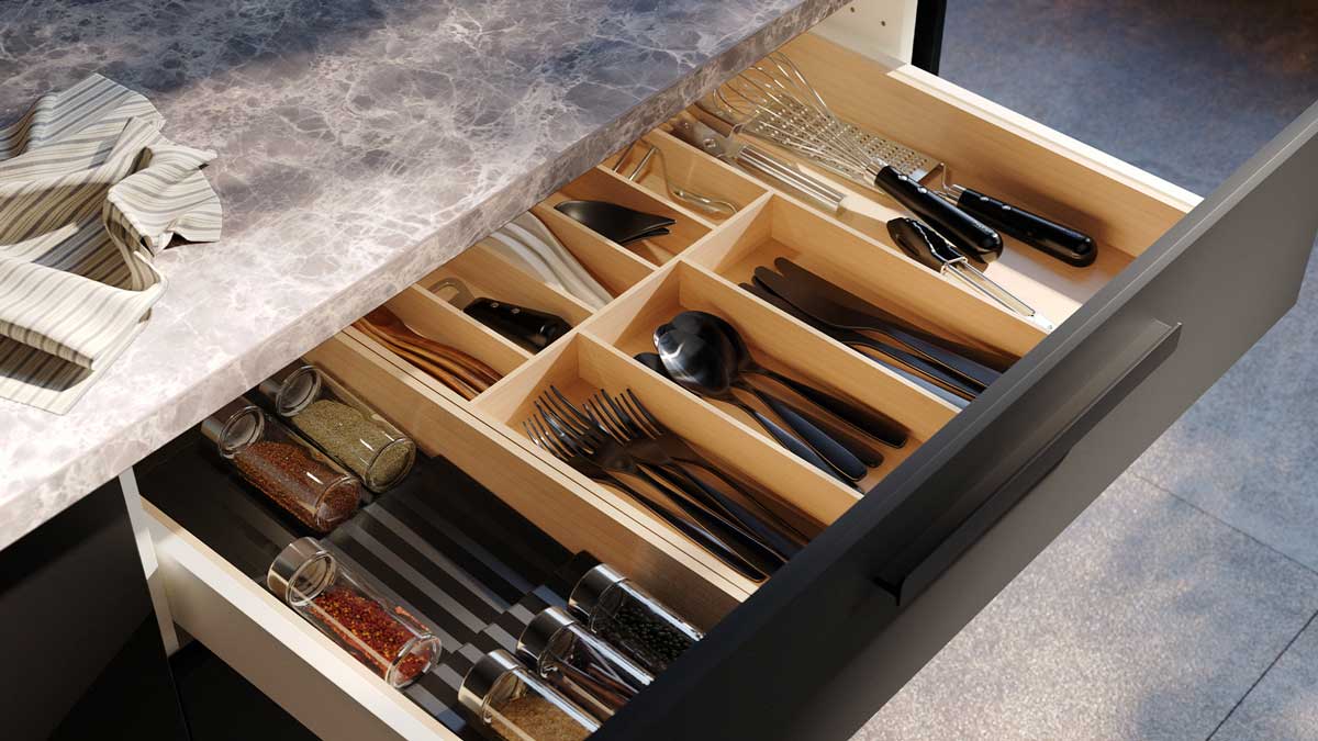 – Insidan kan bli så mycket bättre med alla nya finesser. Avdelare för knivar, köksredskap, bestick, insatser för att hålla runda kryddburkar på plats, genomskinliga burkar för att skapa bra och tydlig översikt i skafferiet, märk gärna upp dina burkar så du har koll på utgångsdatum. Är insidan smart organiserad så kommer även arbetsytan i ditt kök att bli mer tillgänglig och fri för att laga mat, säger Petra.