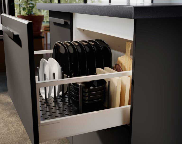 I serien UPPDATERA finner du en hålplatta för lådor med pinnar som hindrar innehållet i dina kökslådor från att glida runt och hamna i oordning. Du kan enkelt placera pinnarna efter vad du förvarar och känna dig nöjd varje gång du öppnar en låda. Det finns även kryddförvaring för liggande kryddburkar i låda i samma serie. Då kan du lätt se vad som finns i varje burk och snabbt hitta det du är ute efter.