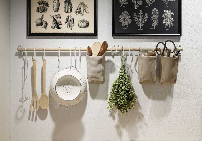 En både rustik och smart förvaring finns i förvaringsserien NEREBY, som går toner av björk och vitt. Genom att hänga upp saker i S-krokar eller på stänger frigör du yta på bänkskivan. De rymliga tygbehållarna är i oblekt och ofärgad hampa.