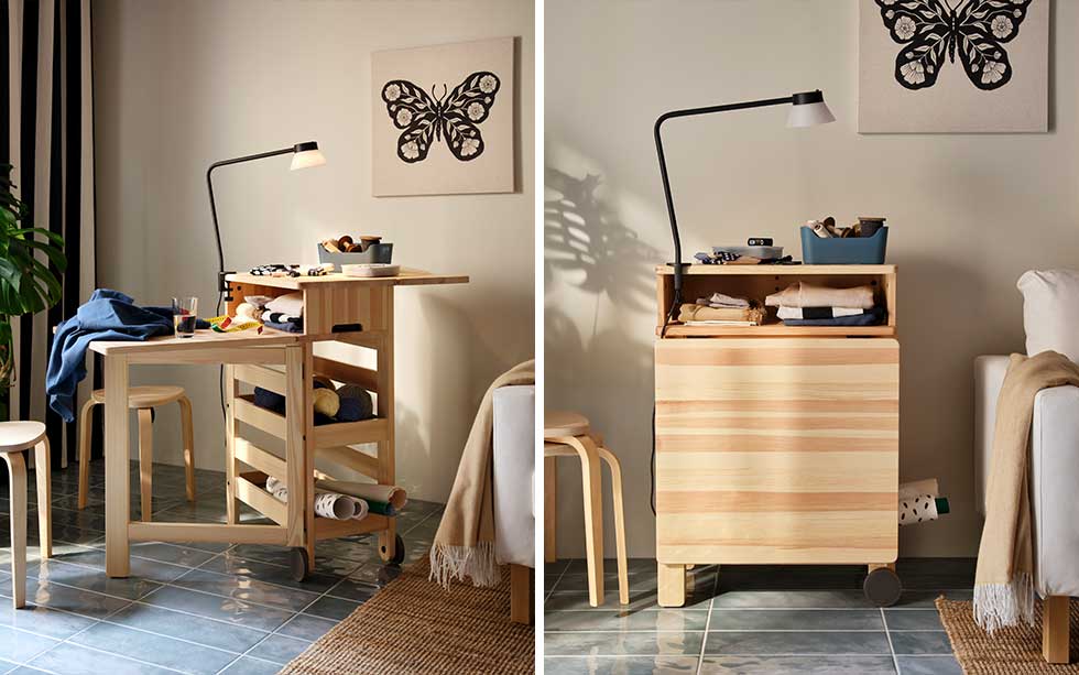 Genom att skapa rum i rummet utnyttjar du ytan i ditt vardagsrum maximalt. En hörna med plats för ett mobilt klaffbord med förvaring blir enkelt till ett alldeles eget hobbyrum när det behövs. Ibland är det barnen som har kompisar hemma och behöver lite extra utrymme att pyssla på. Andra gånger vill du kanske passa på att jobba en stund till, eller ägna dig åt en hobby du älskar. Tricket är att låta möblerna ta plats när det är läge, och rullas undan när ytan behövs till annat.