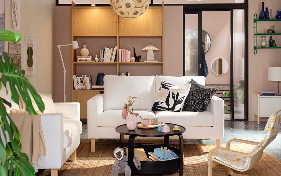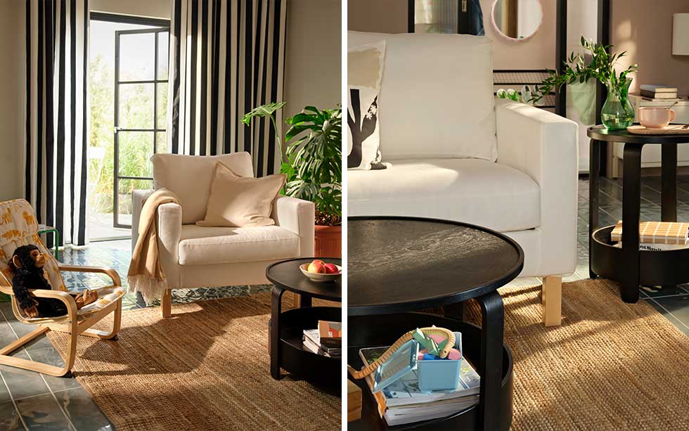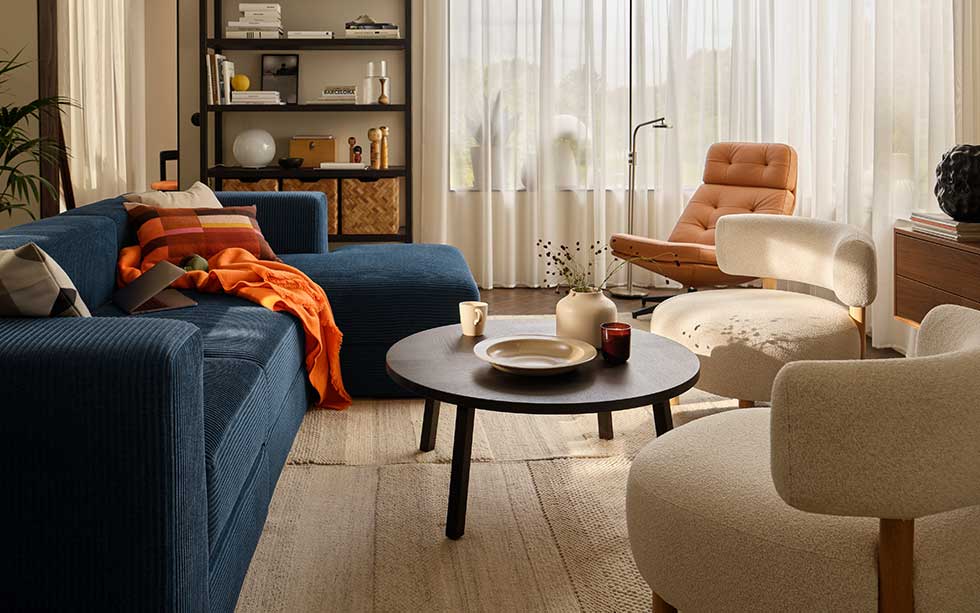 En annan nyckel till det flexibla vardagsrummet är att det finns plats för alla, både långa och korta. Som en stor fåtölj till de stora, och en lite mindre till de små. På så vis känner alla sig välkomna och kan ta det lugnt på ett sätt som passar just dem. Smarta soff- och sidobord gör också alla i sällskapet en tjänst. Rundade former ger både mjukhet och en känsla av harmoni till rummet, och ett säkert alternativ utan vassa hörn att trilla in i. Förvaringen på nedre plan gör det extra lätt att gömma undan det du vill ha nära, som kanske en stickning, favoritgosedjuret eller boken du längtar efter att läsa till kvällen.