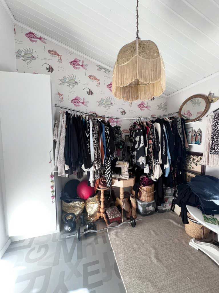 – Jag gjorde om äldsta sonens rum till en walk in closet som en tröst för att han flyttat ut, något som föräldrar med nyss utflugna barn nog förstår. Jag satte upp en klädstång från en befintlig garderob från väggen, men klädstången höll inte direkt måttet och de stöd vi satt upp hade släppt från väggen, säger Karolina.